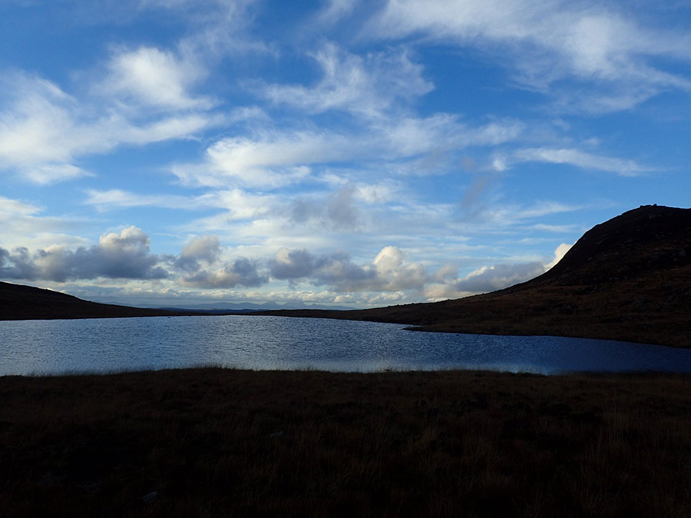 This walk starts at Catacol, but instead of following the main path up the glen, climbs through native coastal woodland to the south to take in Lochan a’ Mhill before heading up to the promontory of Creagan nan Gobhar. From there the main peak of the day, Meall nan Damh (570m), is ascended, the exertion rewarded by spectacular views unfolding of the Kintyre peninsula, the Paps of Jura and Arran’s northern hills. Few other walkers stray onto this Marilyn, increasing chances of encountering mountain wildlife such as birds of prey, red deer and golden plover.